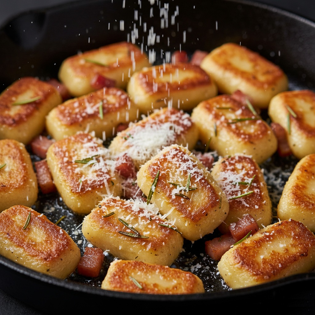 • You can also make your potato-free gnocchi even tastier and crispier by pan-frying them: heat a knob of butter in a pan. Brown 3.5 oz (100 g) of pancetta until the butter begins to foam, then add the cooked gnocchi, warming them for 2 minutes per side. Fry in batches if necessary, then sprinkle generously with grated Parmesan and serve.