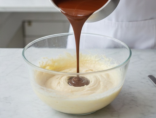 Then add the melted chocolate (it should have a temperature between 113°F and 131°F) and mix until the batter is uniform.