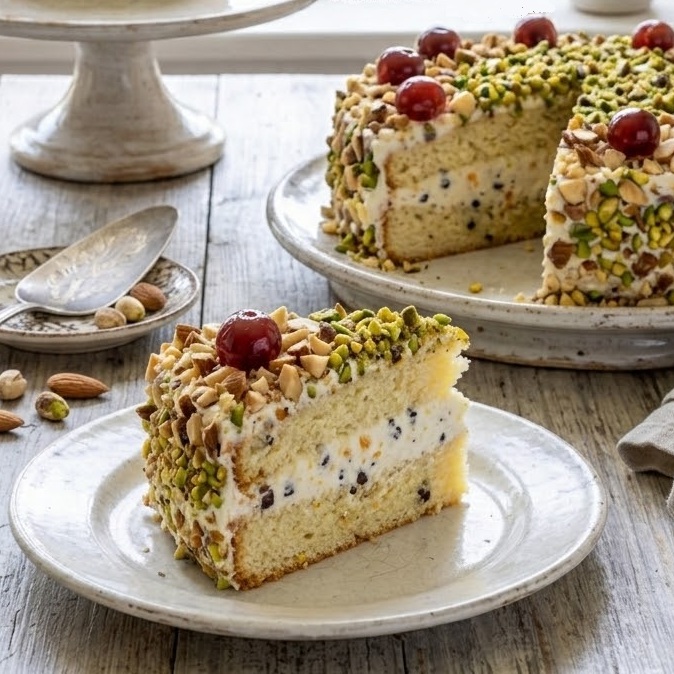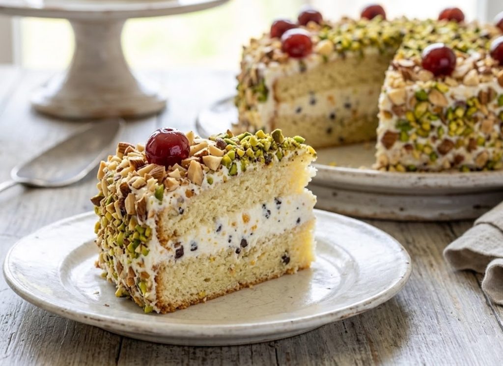 Press the sliced almonds onto the sides of the cake. On top, arrange the candied cherries in a radiating pattern, surround them with additional almonds and fill the center with pistachio crumbs for a vivid color contrast.