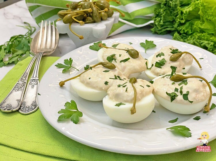 TUNA STUFFED EGGS, often called DEVILED EGGS, are a delicious and quick appetizer made with hard-boiled eggs without yolks and a Tuna, Anchovy, and Caper Cream (the Tuna Sauce).