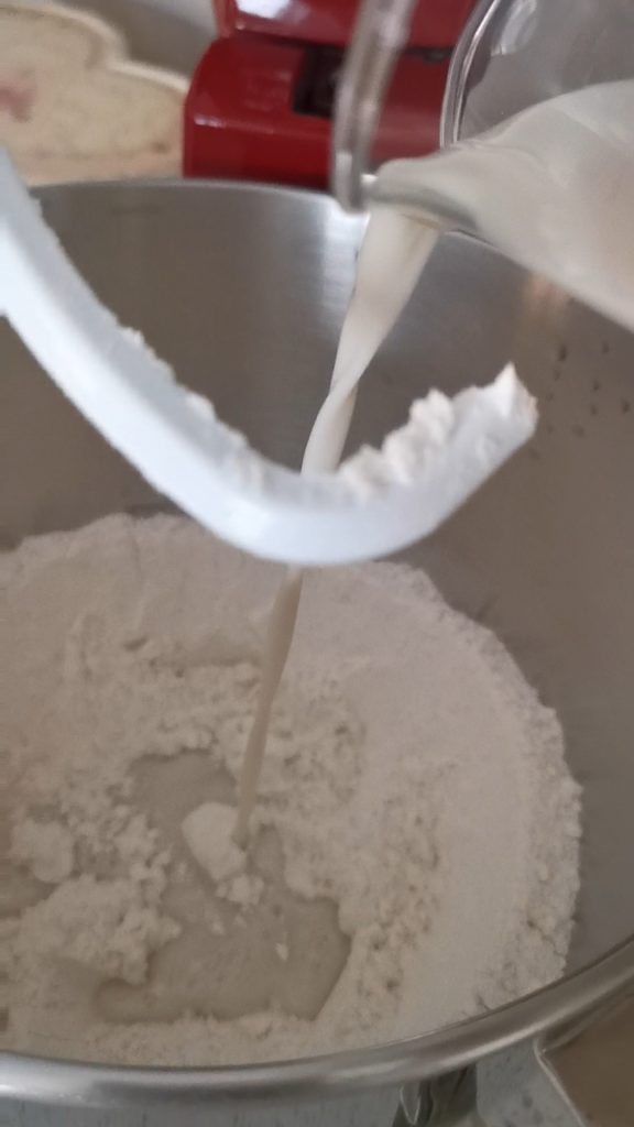 In a measuring cup, dissolve the yeast and sugar in room temperature or slightly warm milk. Let it sit for a few minutes, then start pouring it into the center of the flour and activate the mixer, or begin mixing with a fork or by hand.