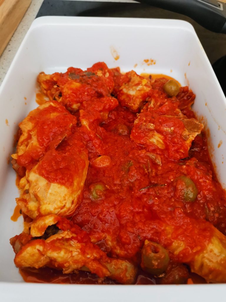 During cooking, the tomatoes release their juice creating a light and flavorful sauce that envelops the chicken, keeping it tender and juicy.