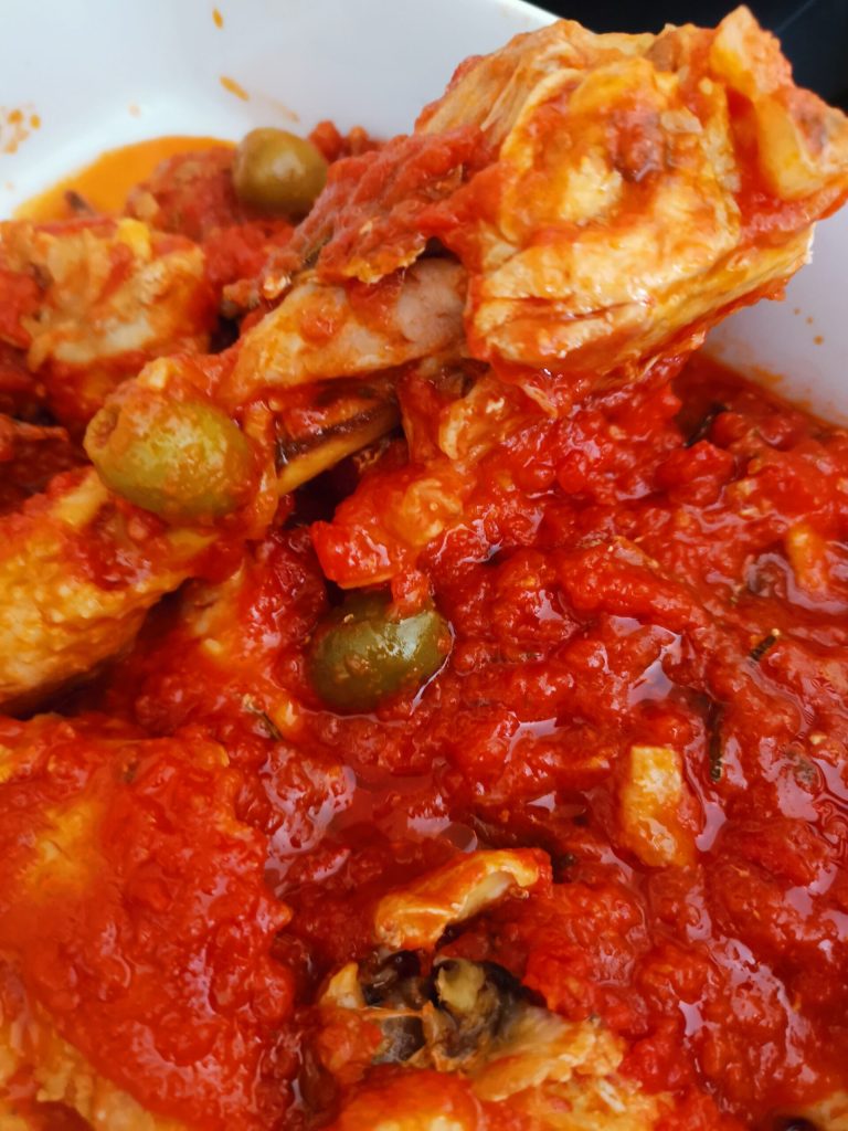 The thighs are added to a light sauce of ripe fresh tomatoes, garlic, herbs, and a drizzle of extra virgin olive oil.