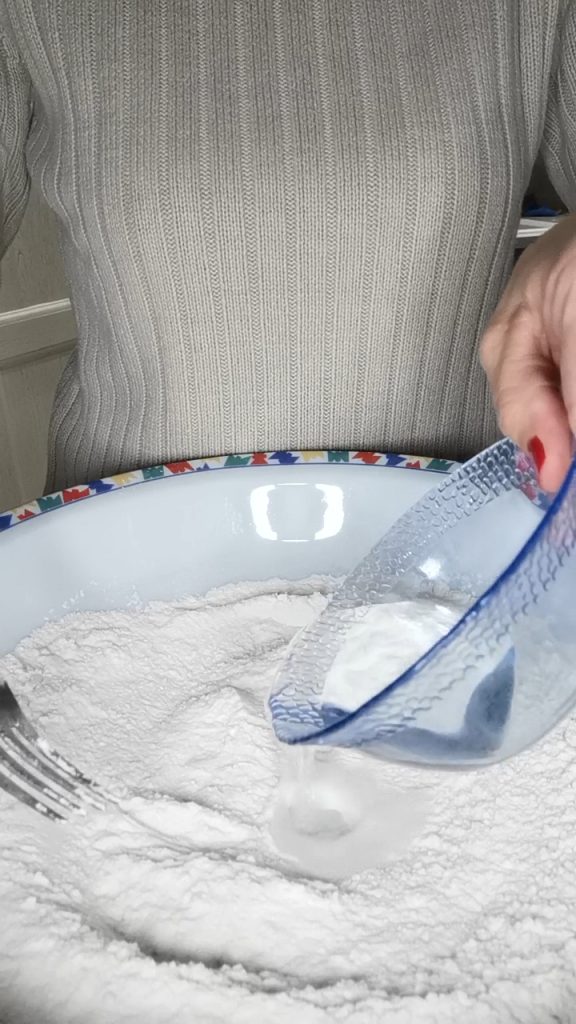 The first step is to pour the flour onto our pastry board or into a large bowl. I have a very large one, where I often work the dough without any issues. Along with the flour, add the salt and yeast and mix.