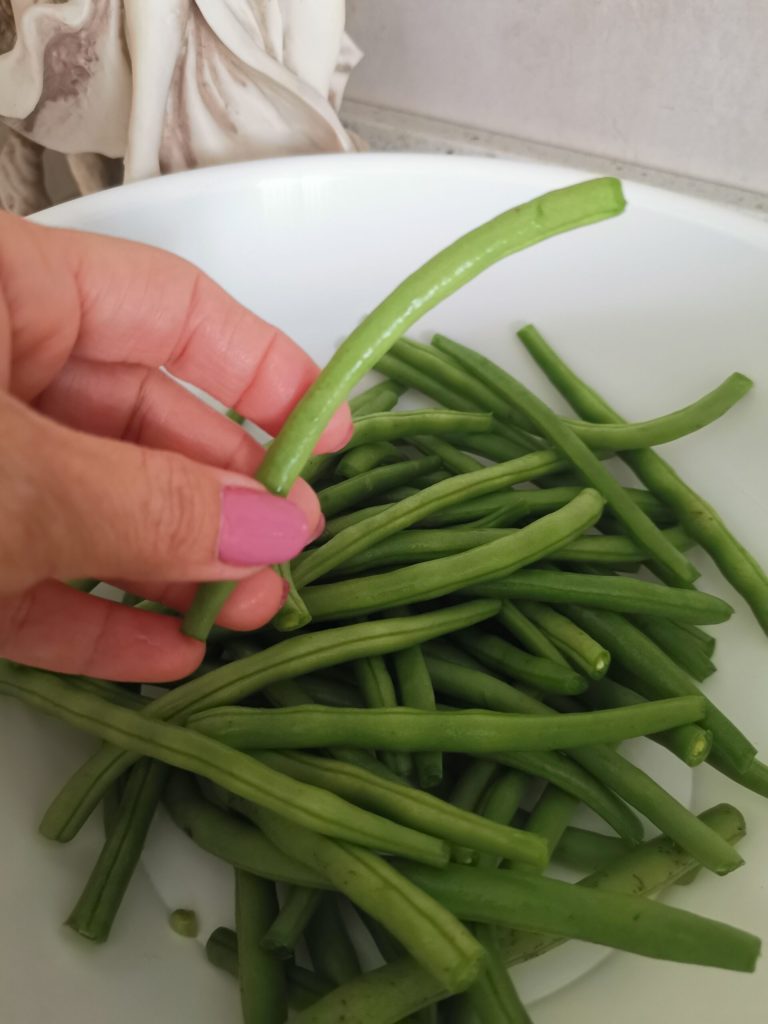 Clean the green beans by cutting the ends, rinse well under water several times and then cook in salted water.