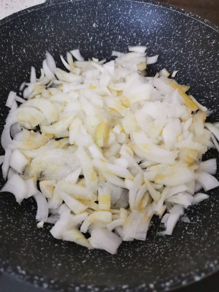 In a pan, chop the onions and garlic and let them soften with a drizzle of EVO oil and salt.