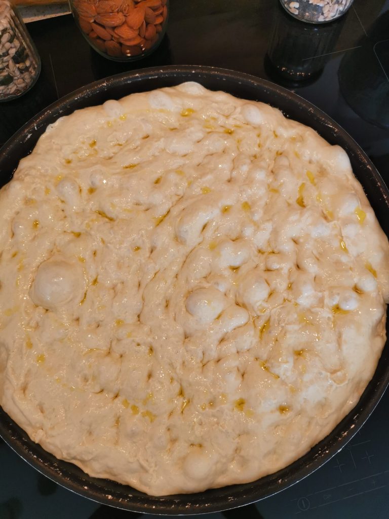 Let it rest for another hour in the pan. My pan measures 35 cm in diameter. I’m leaving you this information because if you spread it in a smaller pan, the focaccia will be even higher and maybe the cooking time might increase a little.