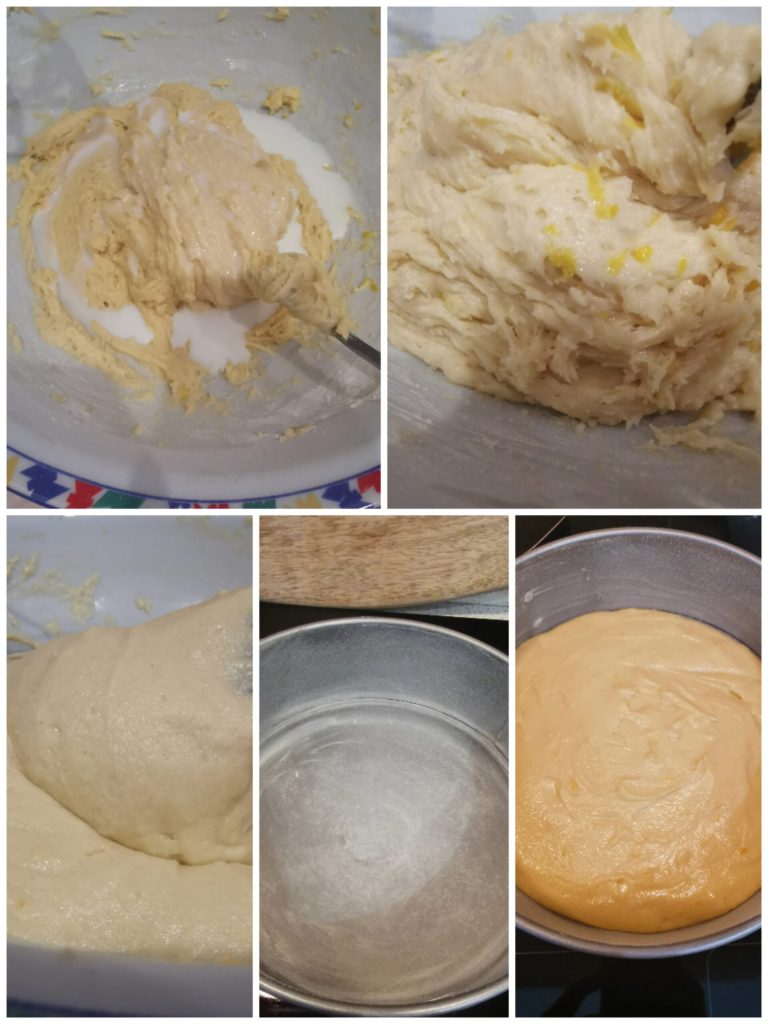 Add a pinch of salt, the grated lemon zest, and the milk gradually.