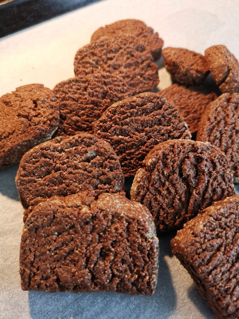 The oat, cocoa, and barley cookies are super delicious little cookies that smell of wholesomeness and chocolate. Then you cut them with a knife, without even needing to roll out the dough and use cookie cutters.