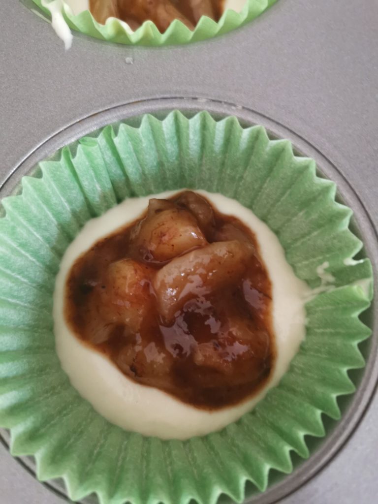 Use a spoon to pour a small amount of batter into the liner or tin, add the fruit compote we prepared and cover with another portion of batter, leveling a bit on the surface to seal the treat and prevent peaches and juice from leaking.