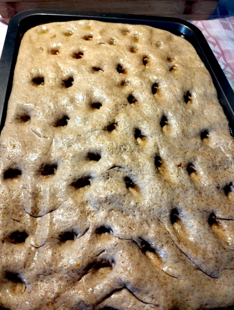 • After the resting time, take the dough and spread it in a baking sheet previously greased with oil at the bottom. Shape it into the classic form with many dimples on the surface.