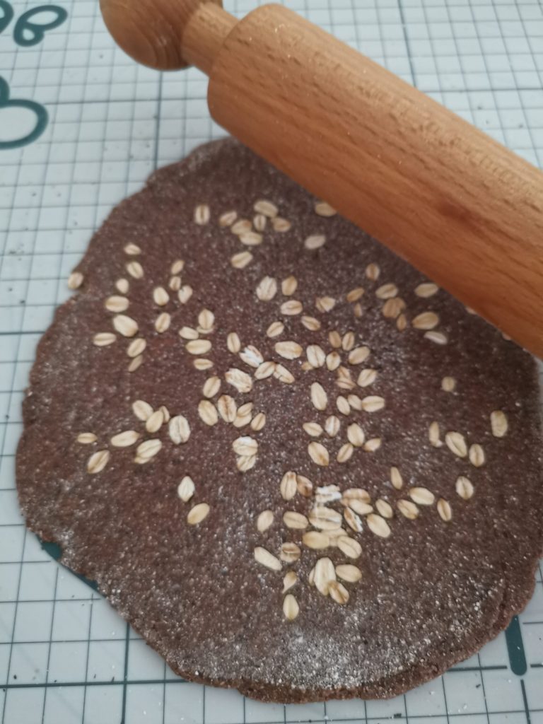 Once rolled out, I sprinkled the rolled oats on top, then went over with the rolling pin to press them into the surface.