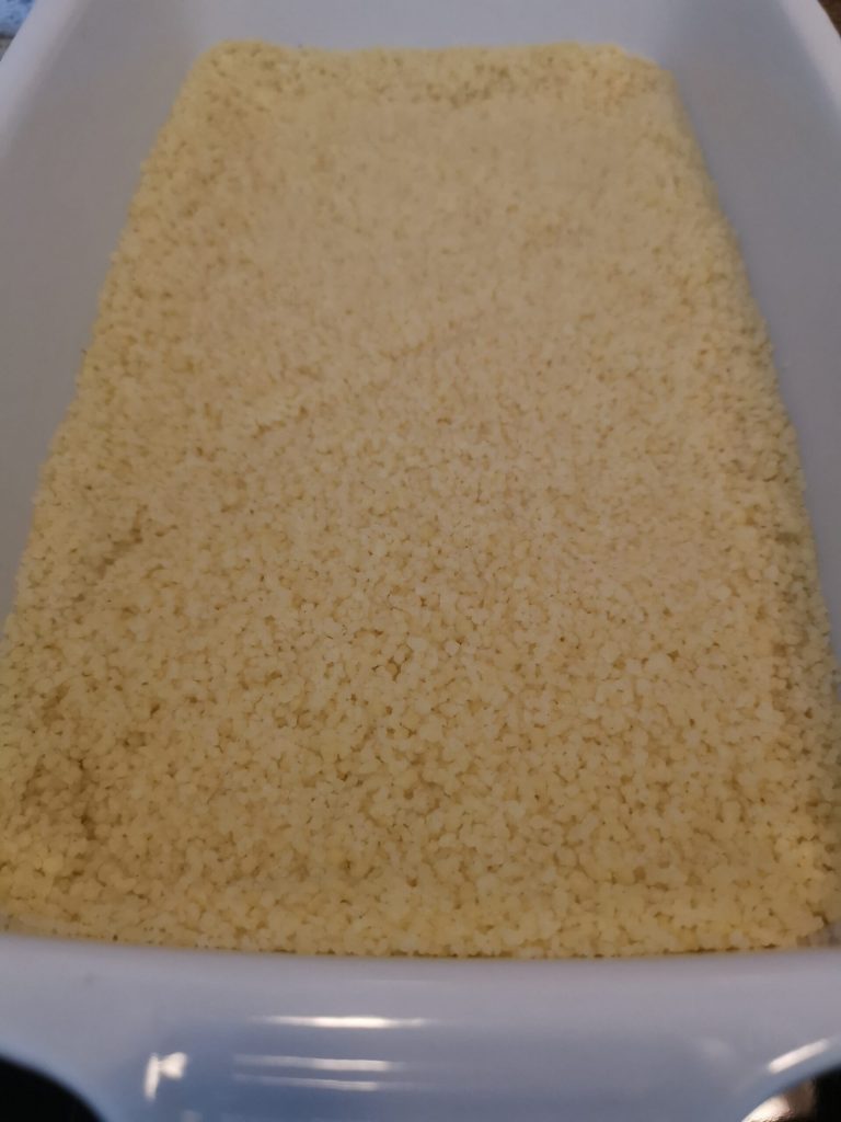 • In a bowl, pour the couscous grains and pour hot water over them.