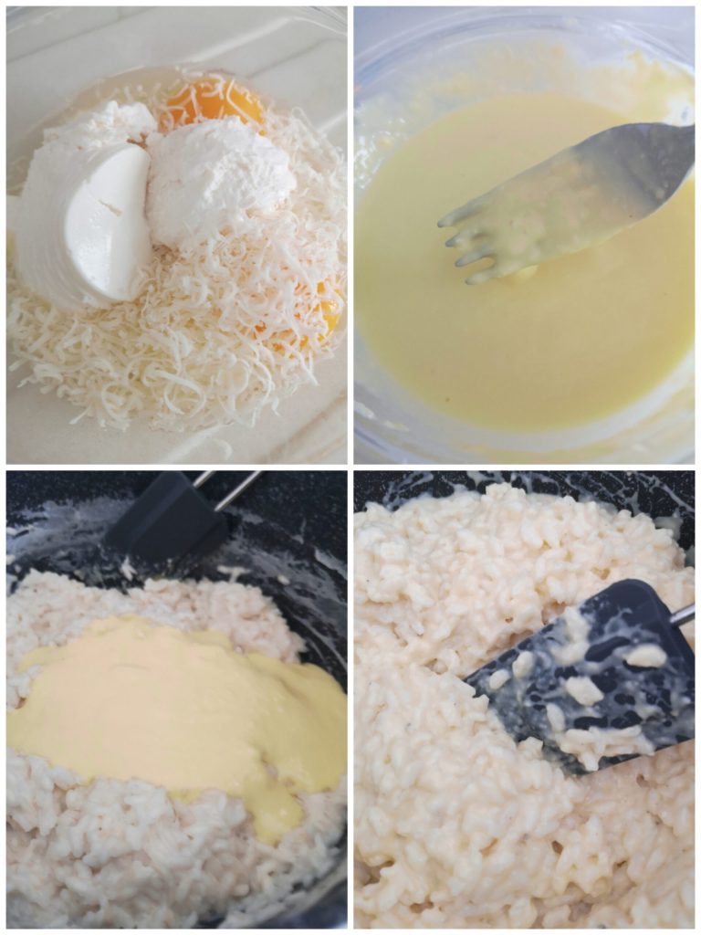 Pour the mixture over the rice once it has cooled slightly and mix well until you have a creamy, even batter.