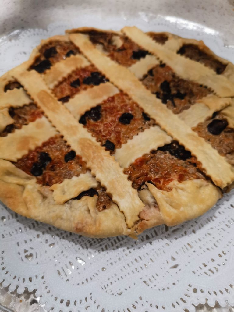 This savory pie beautifully pairs with soft ricotta, champignon mushrooms, and mortadella.