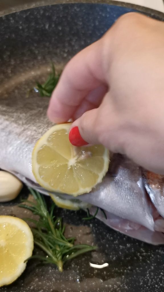 After a few minutes, add the sea bream, on which we will also place some lemon slices.