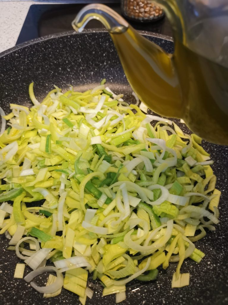 Take a pan and add the leek and a drizzle of extra virgin olive oil. Let it wilt for a few minutes and add the carrots and cabbage.