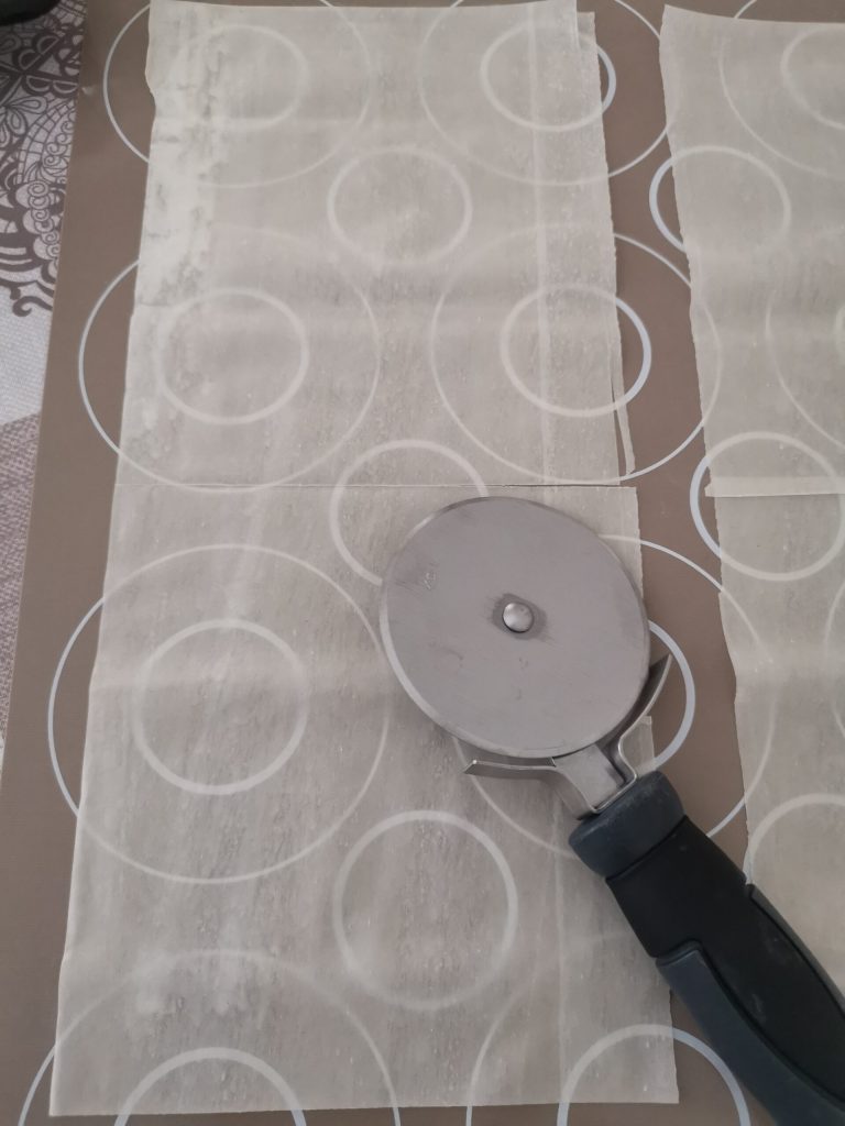 On a pastry board, we spread out the phyllo dough sheets. I divided each sheet in half.