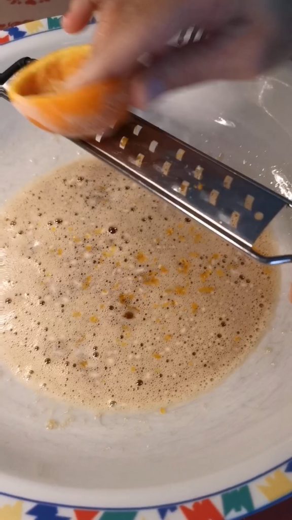 In a container/bowl, pour the eggs at room temperature and the sugar. Start to whisk them until fluffy, also add the pinch of salt and the grated lemon or orange zest.