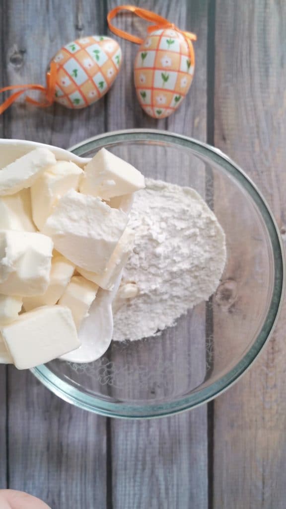 • In a large bowl, pour the flour and cold butter from the fridge, start kneading until you have a sandy mixture, then add the egg,