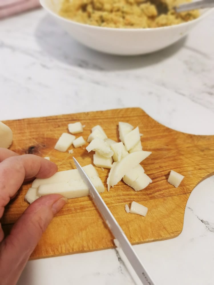 • Take the cheese and cut it into cubes. I used a type of soft cheese like caciotta, but you can use your preferred cheese. Mix the cubes into the carrot and zucchini mixture and blend until you have a soft mixture. If it is too sticky, just add a bit more breadcrumbs.