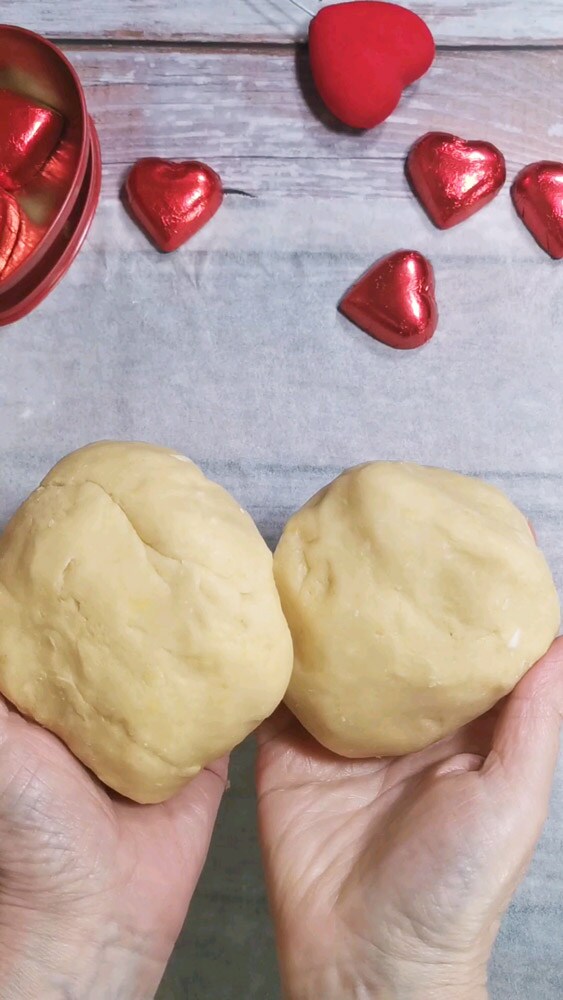 • In a bowl, place the flour and add the butter. Start kneading with your hands until you get a sandy mixture. Add the sugar, the egg and the egg white, the salt, and the grated zest of a lemon. Create a nice soft and homogeneous dough, cut it in two, and color one part with the red coloring. Let the dough rest in the fridge for at least 40 minutes.