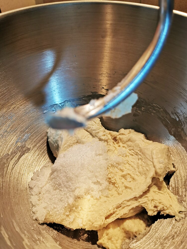 Once the butter has been incorporated well, add the remaining egg yolks and let the stand mixer work until you have a well-bonded dough. Add the remaining 25 g of butter, but melted, and only after it has cooled.