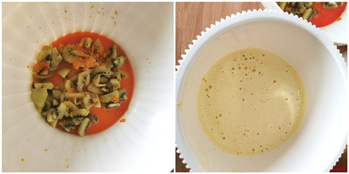 Let’s take the kiwis: peel them and cut them into cubes, place them in a bowl with the orange juice and grated zest. Set them aside for later, in the meantime beat the eggs with the sugar for at least 5 minutes, until they become light and fluffy. Once ready, gradually add the flour and sifted baking powder; mix with a wooden spoon to incorporate them. Be careful not to deflate the mixture and not to create lumps.