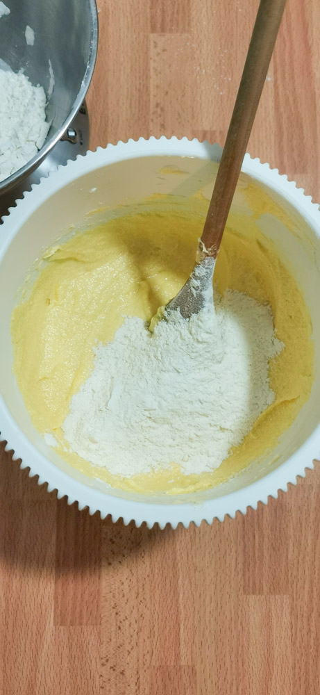 Beat the eggs with the sugar until they become fluffy and volume increases. Once ready, add the soft butter and mascarpone. Mix the mixture with a hand whisk until it becomes a soft cream. Add the pinch of salt, the sifted flour, and mix the dough without creating lumps.