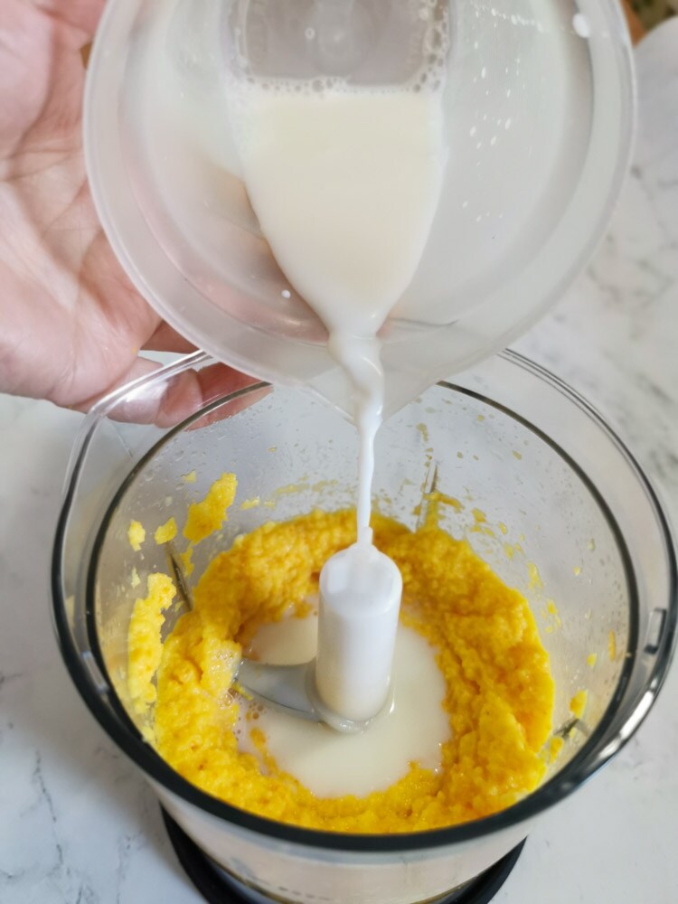 Wash the orange and cut it into pieces, including the peel, making sure to remove the seeds. Place it in the mixer and blend a little, then add the milk and oil.