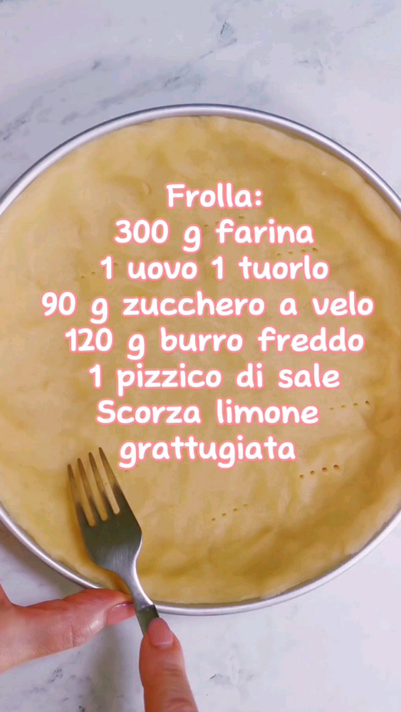 Once ready, roll it out, cover a 9 or 10-inch tart pan, and prick the pastry with a fork. Place the pan in the fridge to rest for 30 minutes. After the time has elapsed, take the base from the fridge and cover it with the crushed biscuits.