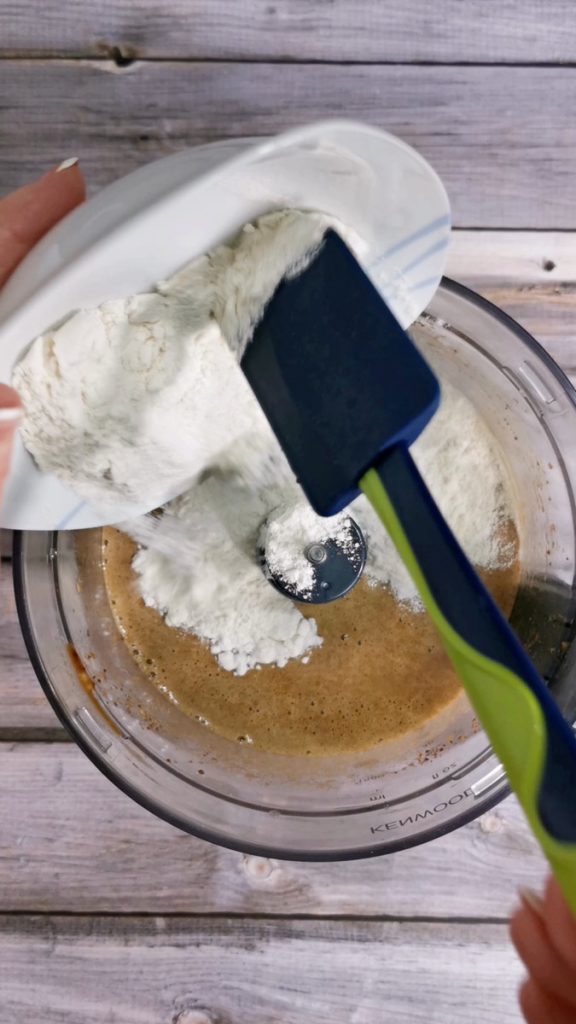 Add the flour and baking powder, then blend the ingredients again until a smooth and creamy batter is obtained, finally add the chocolate chips.