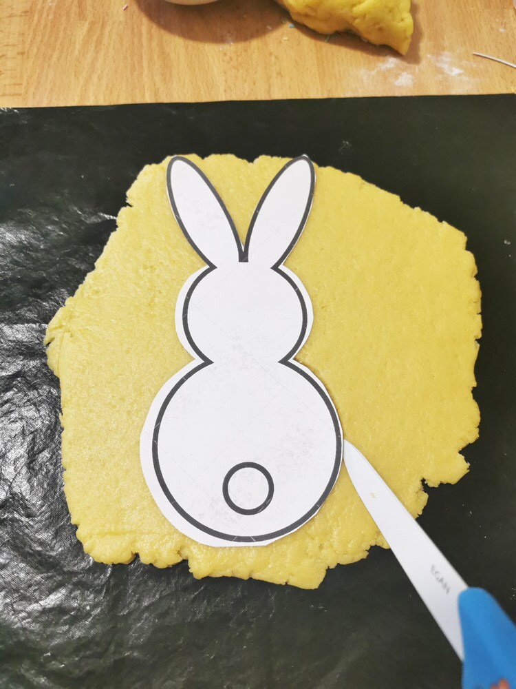 Make space to position the previously cooked egg in the center and secure it with dough strips, brush the dessert with a little beaten egg. Finally, add colored sprinkles for garnish. Line a baking sheet with parchment paper and place our treats on top, keeping them spaced as they will expand a bit during baking.