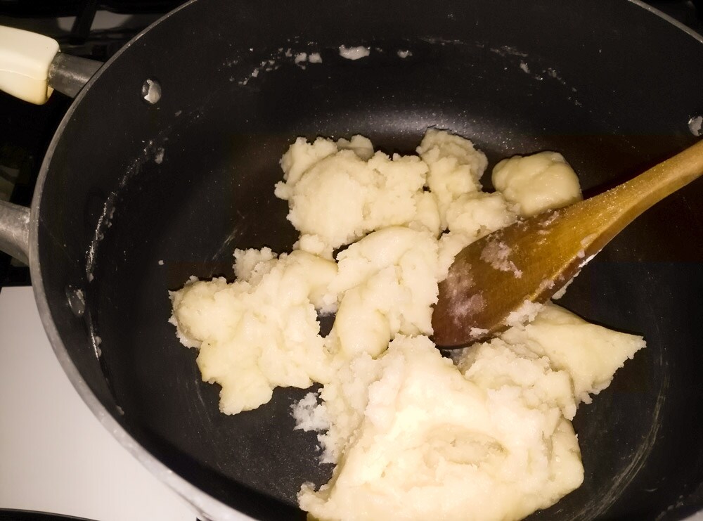 Mix the ingredients vigorously with a wooden spoon and put the pan back on the heat. Cook for about 2 minutes, always stirring, this way the dough will detach itself from the sides forming a ball; in fact, when you hear it sizzle, you can say it’s ready.