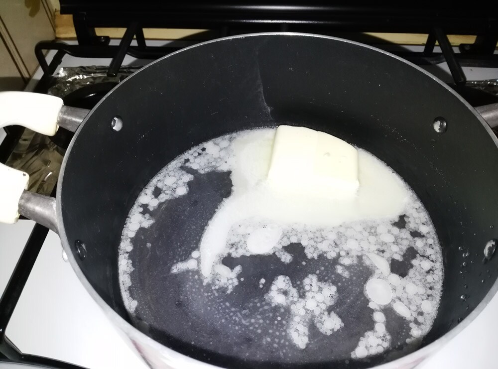 In a pan, place the water, salt, and butter cut into pieces, bring to a boil, and remove from the heat. If the butter seems not completely melted, just stir the mixture with a wooden spoon.