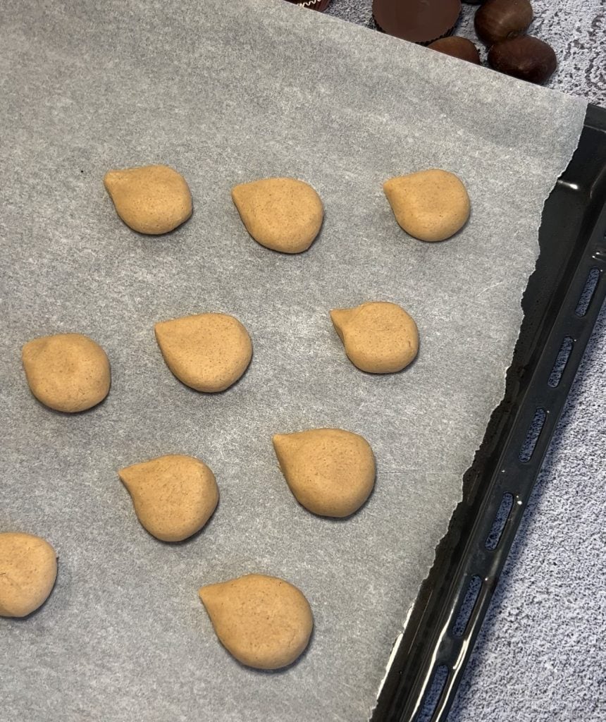 After the 30 minutes of rest in the fridge, take the dough and form the cookies. I had fun shaping the shortbread into chestnut shapes, first making balls and then elongating the tip.