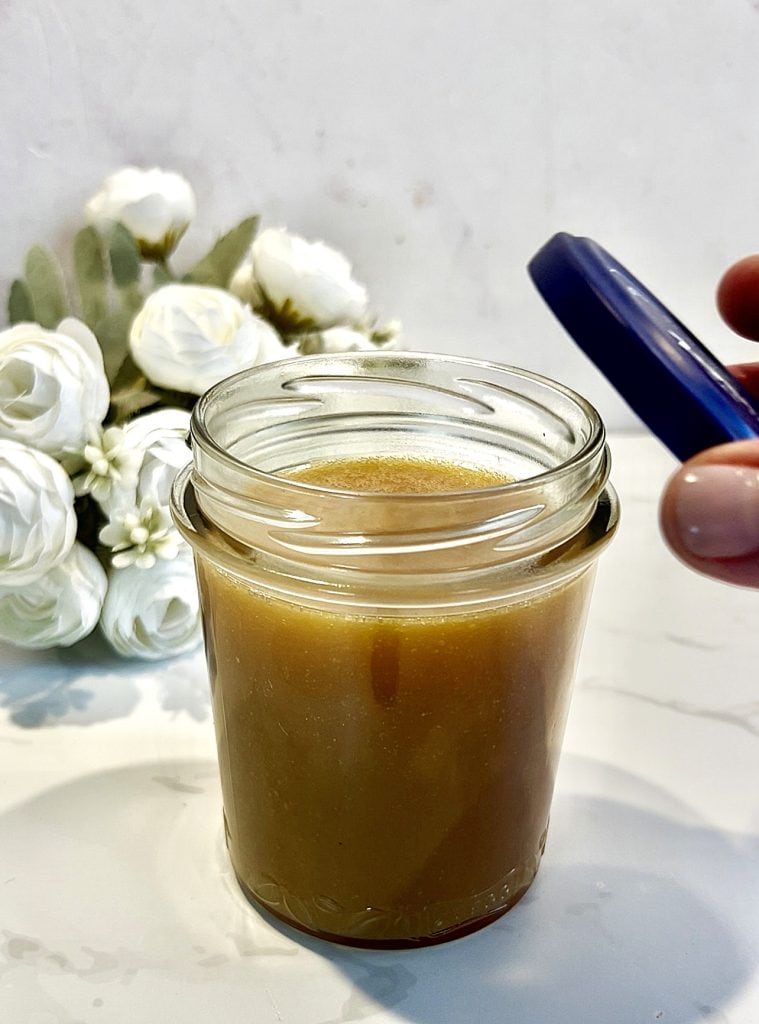 Let the salted caramel sauce cool at room temperature, then transfer it to a clean glass jar. Once cold, the consistency will become denser and creamier.