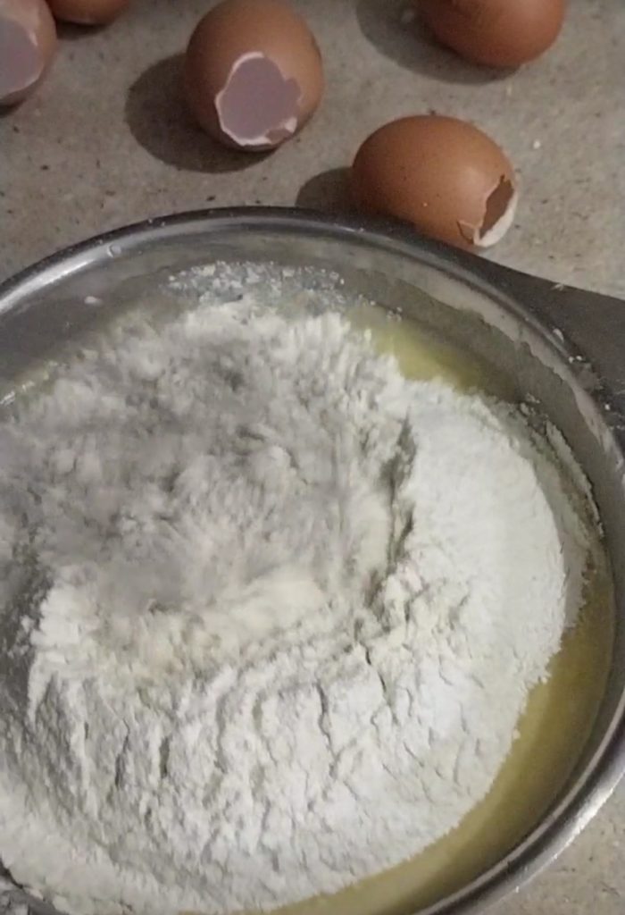 Sift the flour with the baking powder and add them to the egg mixture.