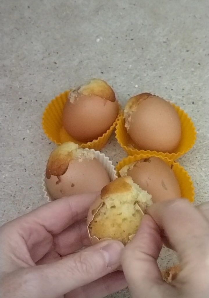 Now take the egg shells and place them inside the muffin cups (they should be rather small, 1.8 inches in diameter and 1.2 inches in height). To keep them upright, I placed parchment paper around the shells. If you have spray butter, you can spray a little inside, I didn’t use any. Put about two and a half teaspoons of the mixture inside each shell, filling them about halfway.