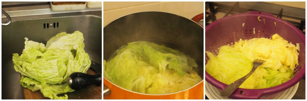 Fill a pot halfway with water, when it boils add a pinch of salt, the cabbage leaves and cook for about 5/10 minutes, until they are soft but not too much.
