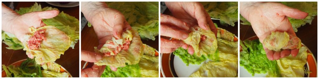 Now take a cabbage leaf, put some of the meat mixture (about 1.4 oz), roll the leaf, tuck the two outer parts inward and finish rolling your roll.