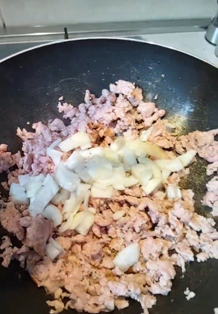 Put a little oil in a wok and add the sausage without the skin and crumbled. Cook it for a few minutes, then add the finely chopped onion.