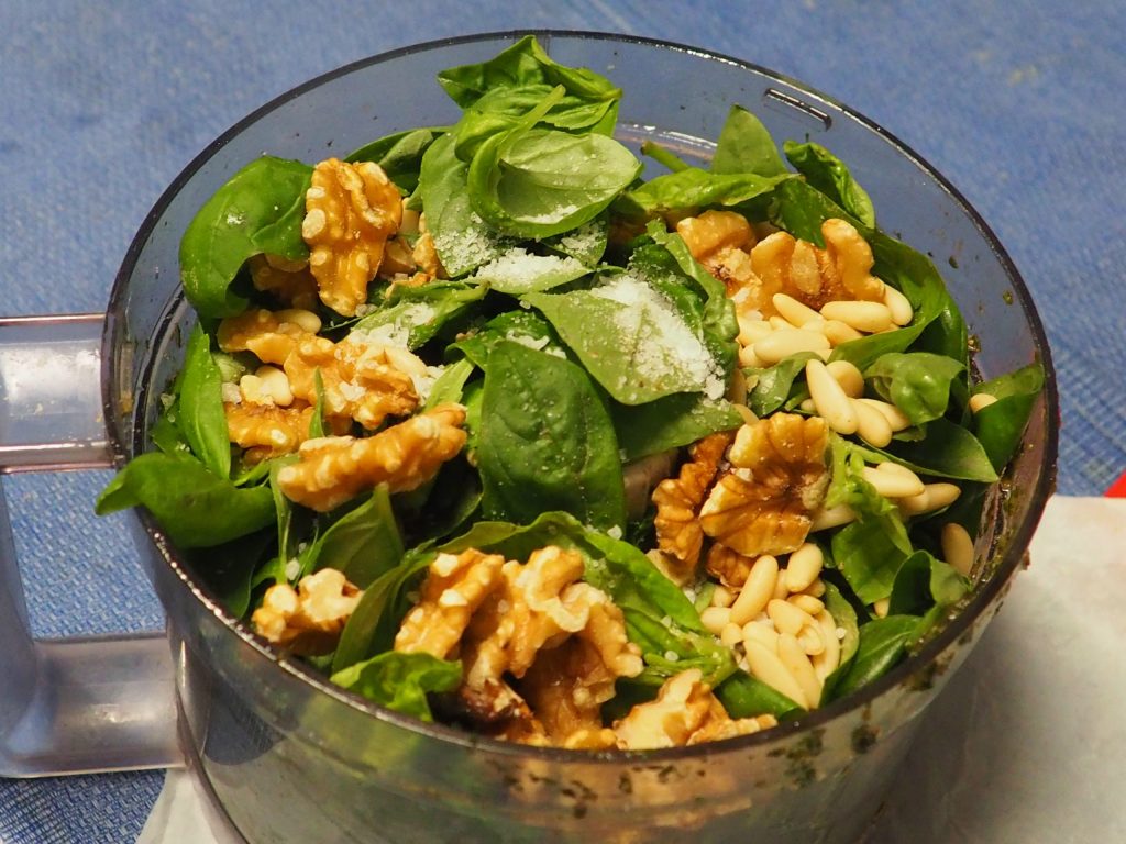 The original pesto recipe is made with pine nuts only, but I wanted to add some walnuts. We really like the flavor they give, but if you prefer, you can use just pine nuts.