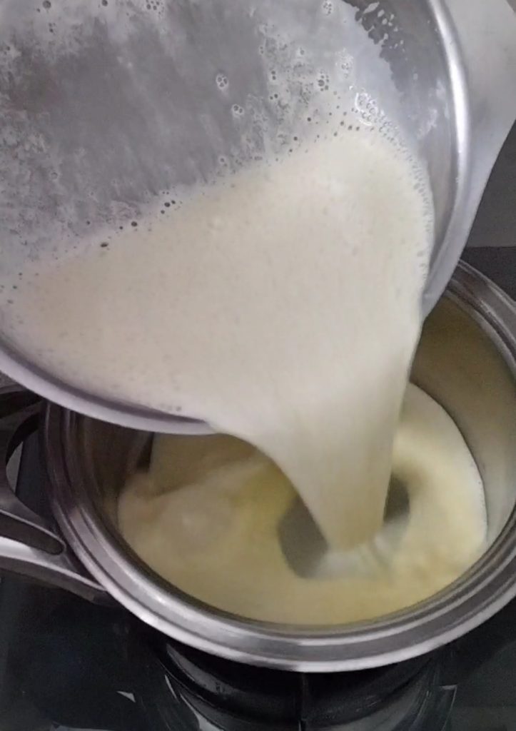 Heat the milk until just before boiling and then pour it over the egg mixture.