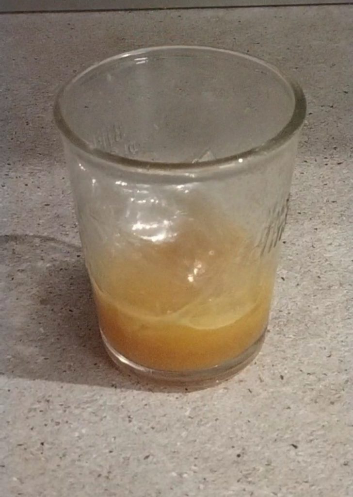 Squeeze the oranges with a juicer until you get a total of 3/4 cup of juice. To make it smoother, I strained it to remove any pulp residue. Place the juice in a bowl, heat a little in a glass, add the pre-soaked and squeezed gelatin sheets, and stir until completely dissolved. Now pour it into the bowl with the remaining orange juice.