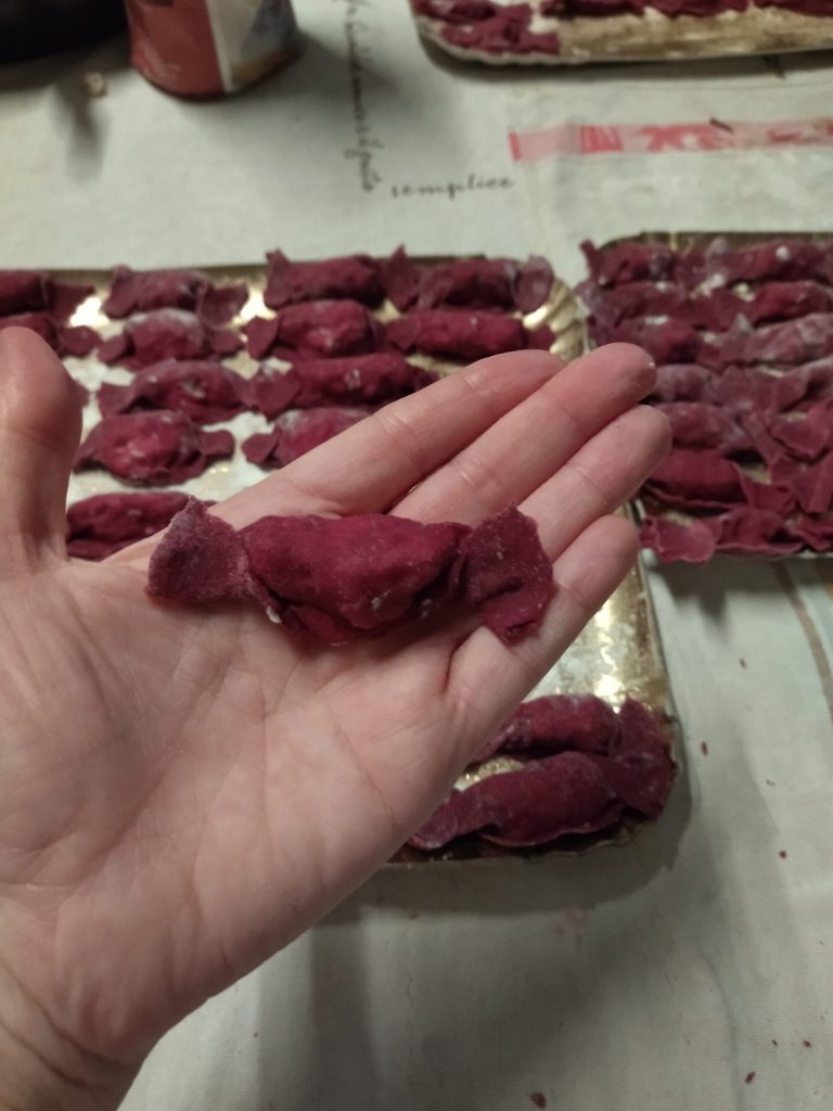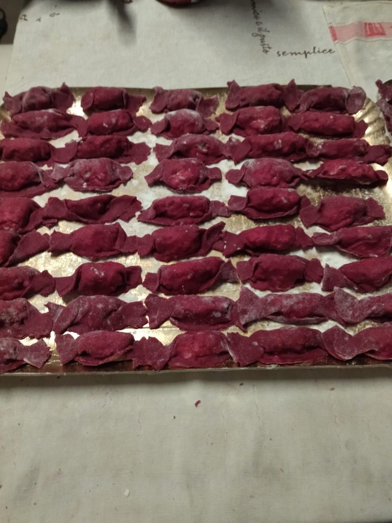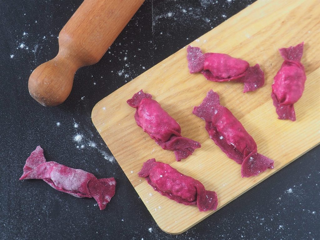 These Beetroot Candies with Meat Filling are truly beautiful to see and great to taste. I love the natural color that the beetroot gives to fresh pasta; I find it really cheerful and vibrant. Ideal for holidays, but also for a Sunday lunch.