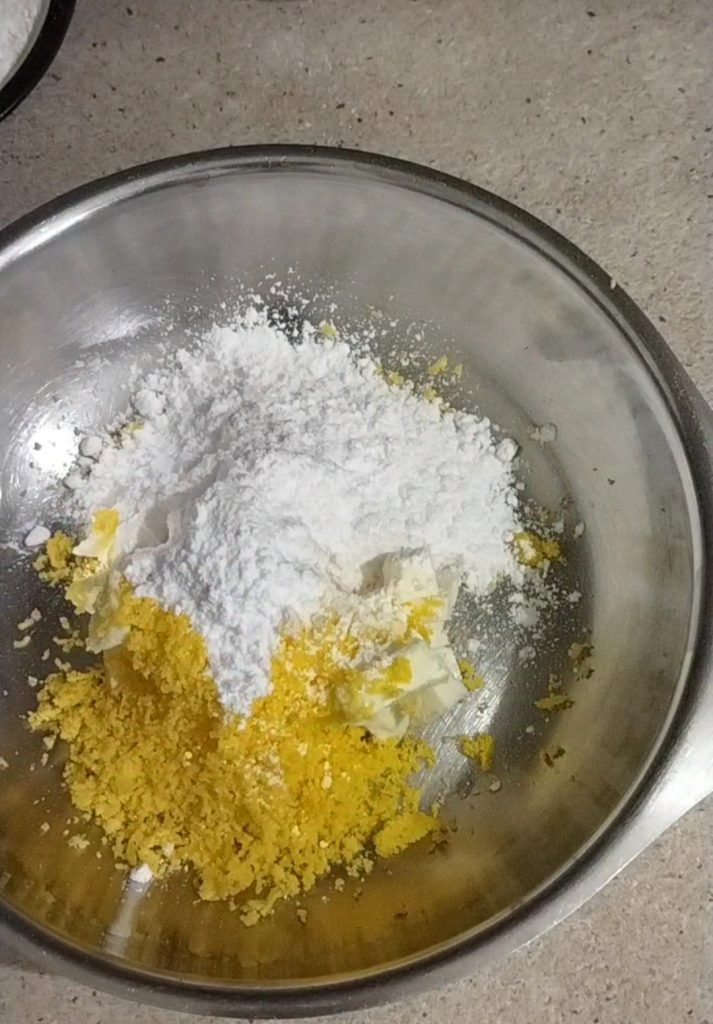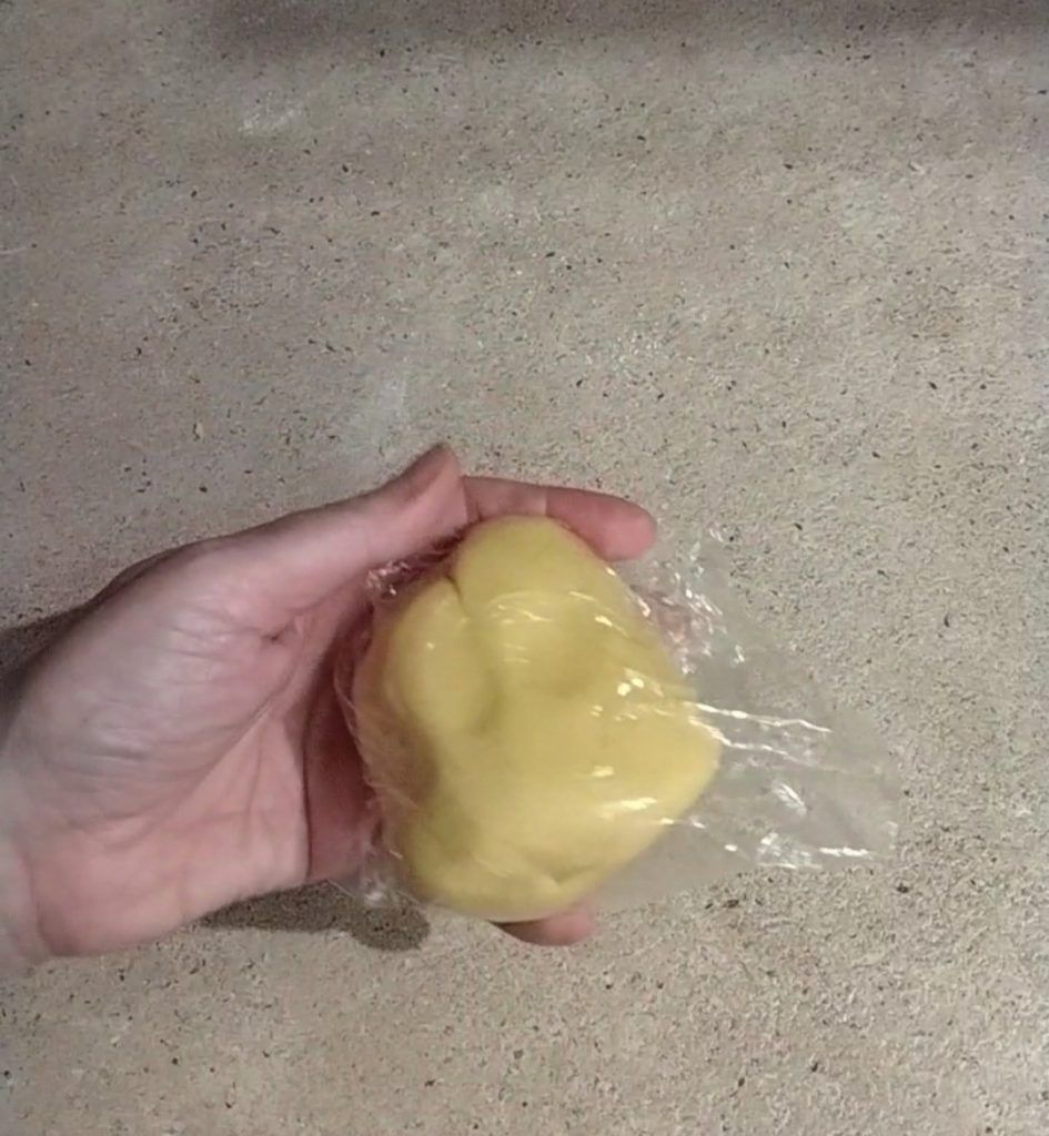 Now add the flour and cornstarch. Mix first with a fork or spoon, then knead it with your hands on a pastry board. You need to obtain a soft ball, wrap it in plastic wrap, and put it in the fridge for at least half an hour.