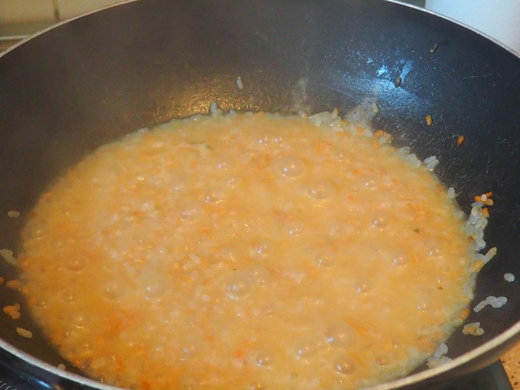 At this point, as it dries, add a ladle of broth, stir, and continue for about 10 minutes.