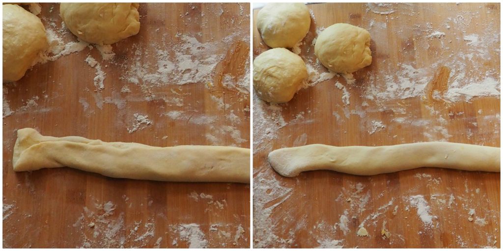 Roll out each ball on a floured work surface with a rolling pin into a rectangle about 16×4 inches.
