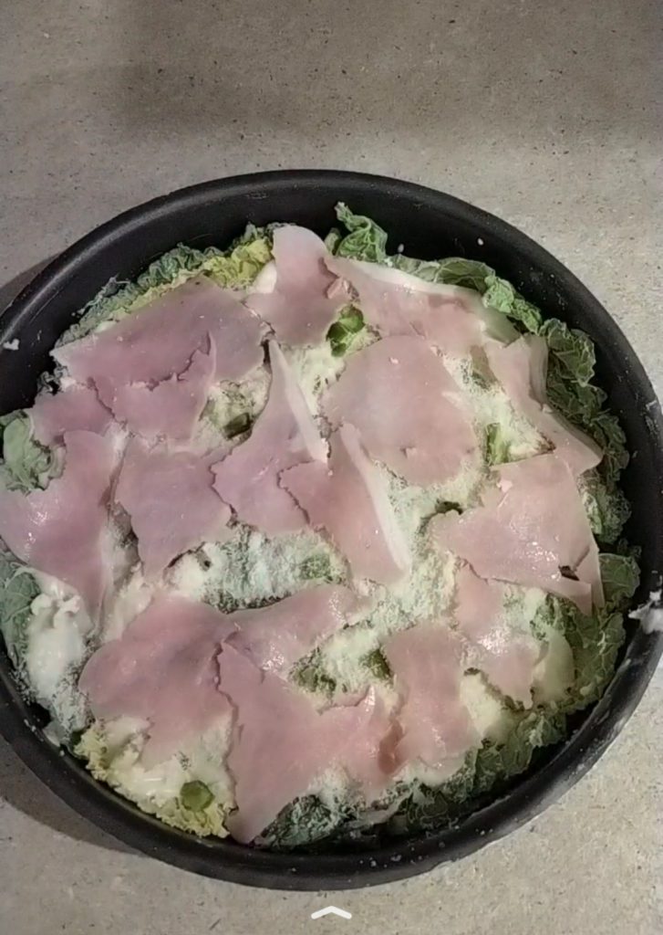 Once again, cabbage, béchamel, pieces of ham, cheese slices, and Parmesan.